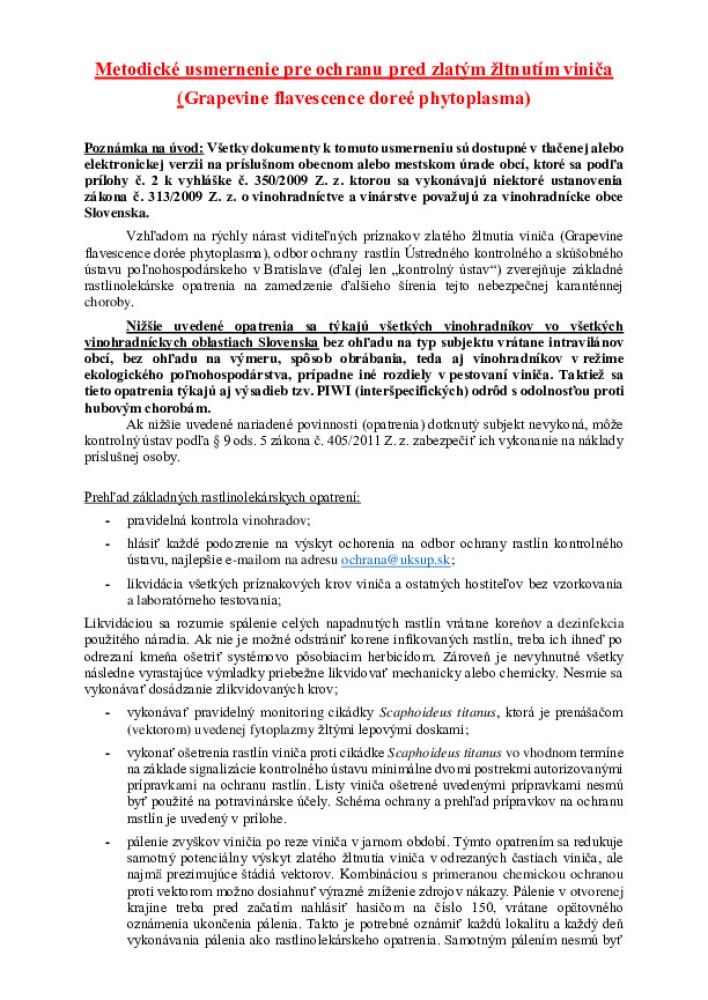 • V prípade podozrenia na zlaté žltnutie viniča kontaktujte Ústredný kontrolný a skúšobný ústav poľnohospodársky v Bratislave cez email: ochrana@uksup.sk